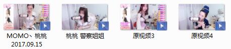 PS:本资源所包含的视频分别是:MOMO丶桃桃2017.09.15,桃桃 警察姐姐,原视频3和原视频4,共有485MB,视频缩略图如下: